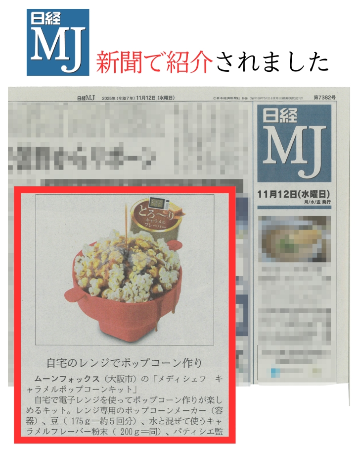 メディア掲載のお知らせ(日経MJ掲載) 2026.02.15 お知らせ 2025年11月12日発行の『日経MJ』新製品コーナーにて、弊社のポップコーンキットが紹介されました。 Xでシェア Facebookでシェア URLをコピー